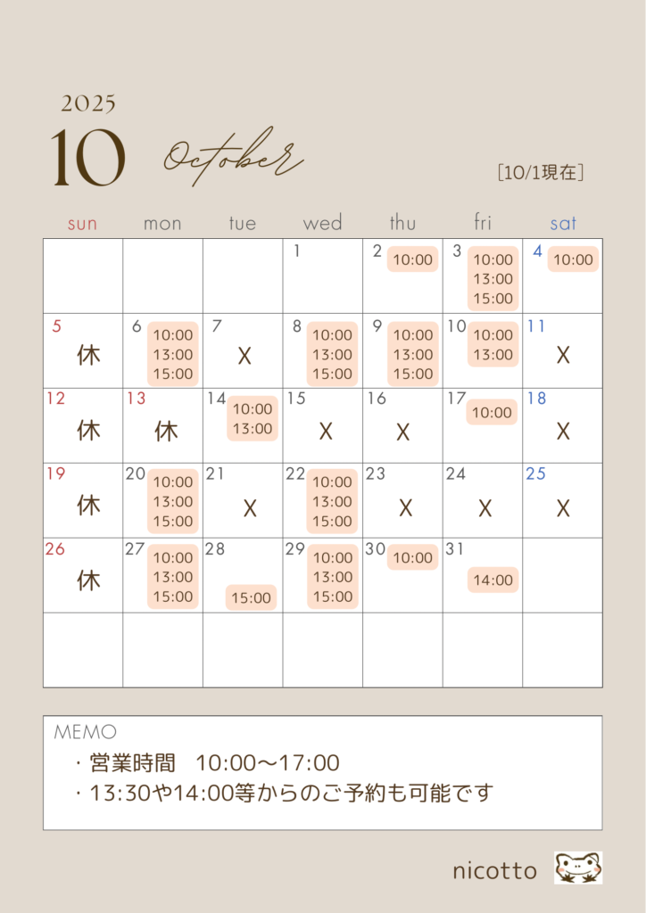HOME > 未分類 > 未分類 10月カレンダー 2025年10月1日 やっと暑さが和らいできた10月。 朝晩と昼間の寒暖差が大きい日もあり、体調管理が難しい季節です。 短い(多分)過ごしやすい時期を満喫できるよう 軽い身体の準備をしていきましょう♪ Twitter Share コピーする -未分類